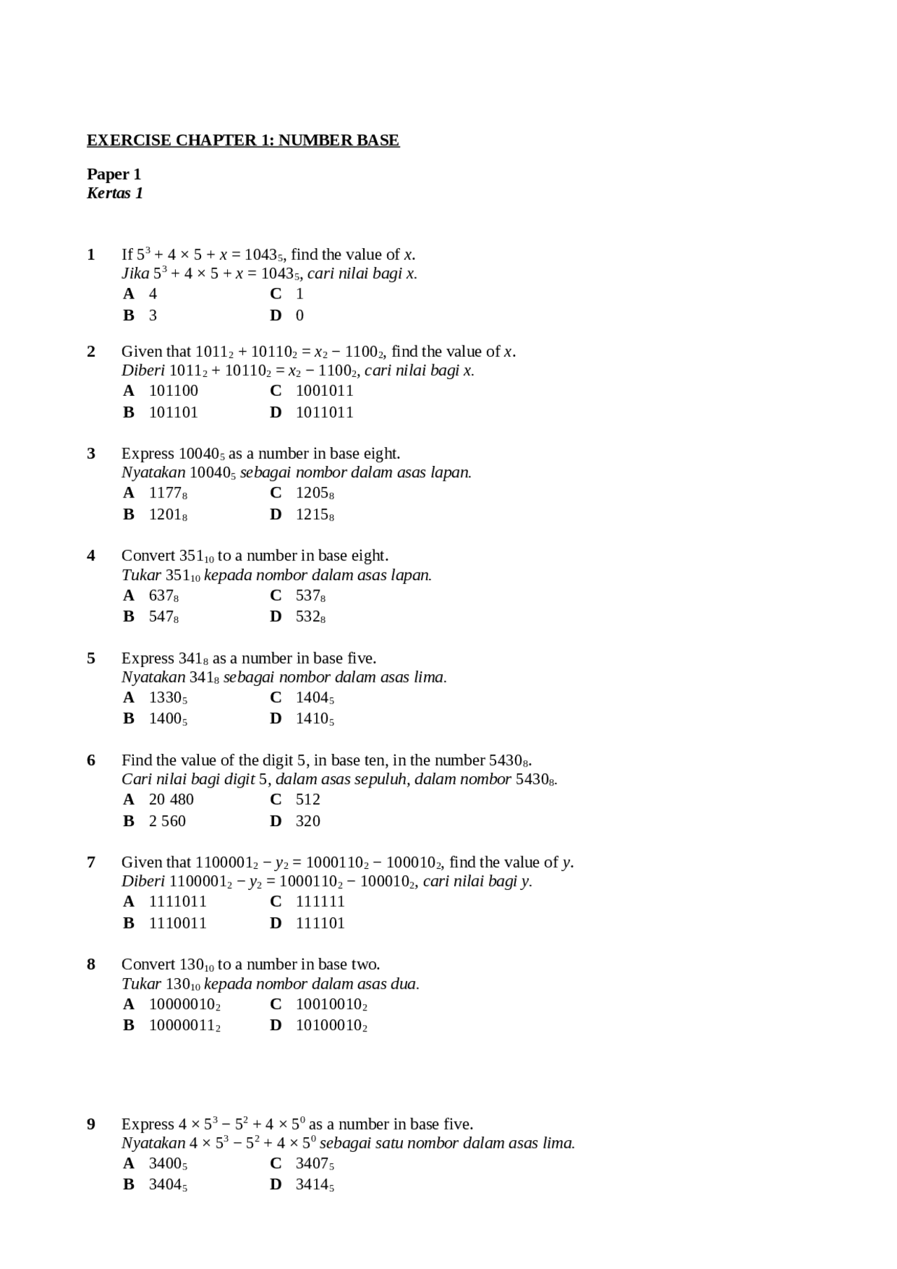 Email protected 1 BAB 1 ASAS NOMBOR Number Bases Kertas 1 SPM 2 soalan 2markah BIL SUBTAJUK ms 11 Nombor Dalam Asas Dua 1 12 Nombor Dalam Asas Lapan 4 13 Nombor Dalam Asas Lima 5 14 Menukar Nombor Dalam Asas Sepuluh Ke Asas Dua Lapan atau Lima 7 15 Menukar Mana-mana Di Antara Nombor Dalam Asas Dua Lapan atau Lima 10. Kebiasaannya kita hanya didedahkan kepada asas nombor 10.